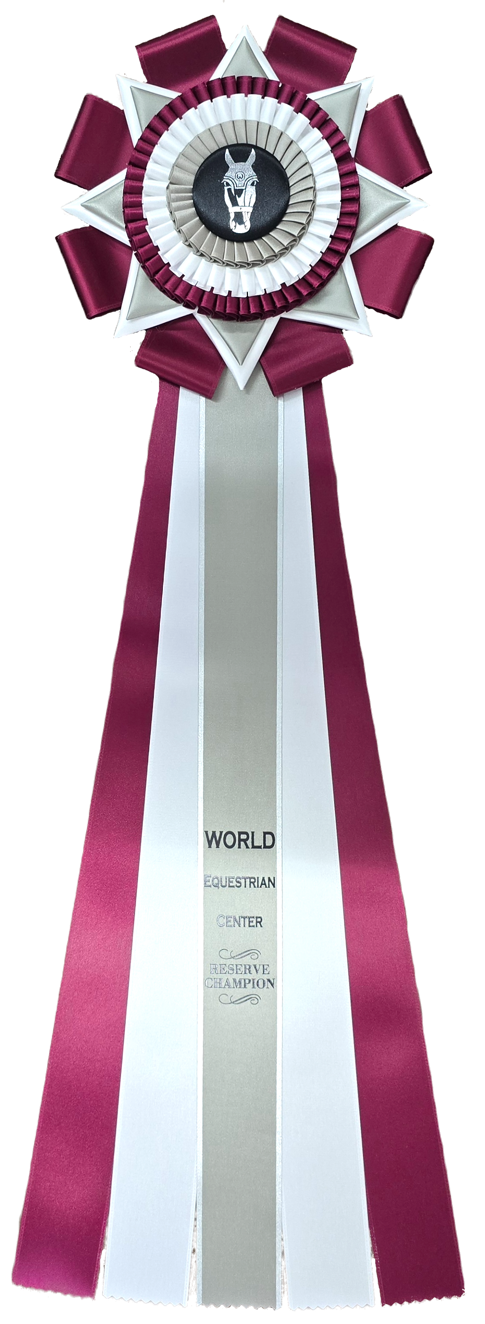 E-165 Deluxe+ Rosette Award Ribbon (5 Streamers) Our E-165 Deluxe+ Rosette takes our Deluxe Rosette to the next level with an added outer layer of pleated rosette, creating a larger, more dramatic presentation for top honors. This design features four layers of pleated rosettes for bold dimension, accented with double-layered handmade points and folds for a refined, high-end finish. Completed with five long streamers (in your choice of length) and ready for foil imprinting with your show name, class, and placing. Made in the USA using imported & domestic materials. Customize options: Ribbon color selection Choose streamer length Custom text (class, placing, sponsor, date, etc.) Foil stamping color: Gold, Silver, or Black Logo: full-color printed or foil-stamped (foil stamp die is an additional charge)